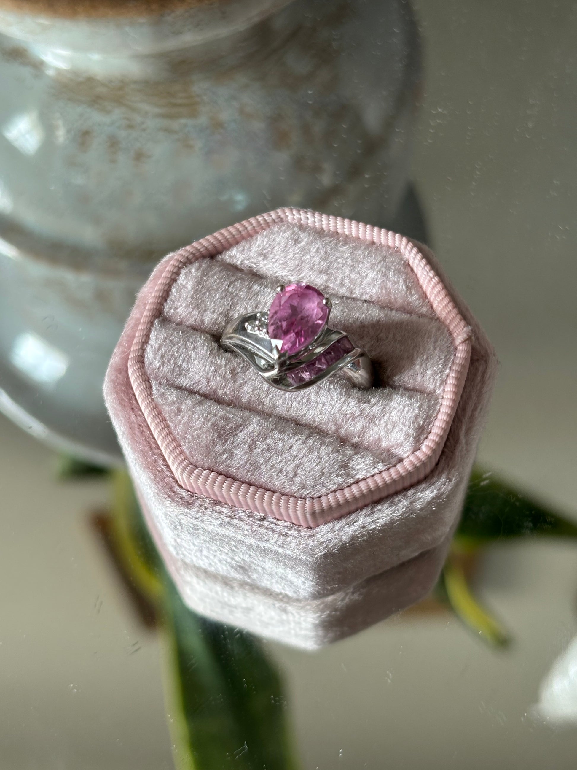 This vintage 10 karat gold ring is absolutely beautiful. The pink lab created sapphires and diamond twisted details are amazing. 4.26 grams. This ring is a size 8.