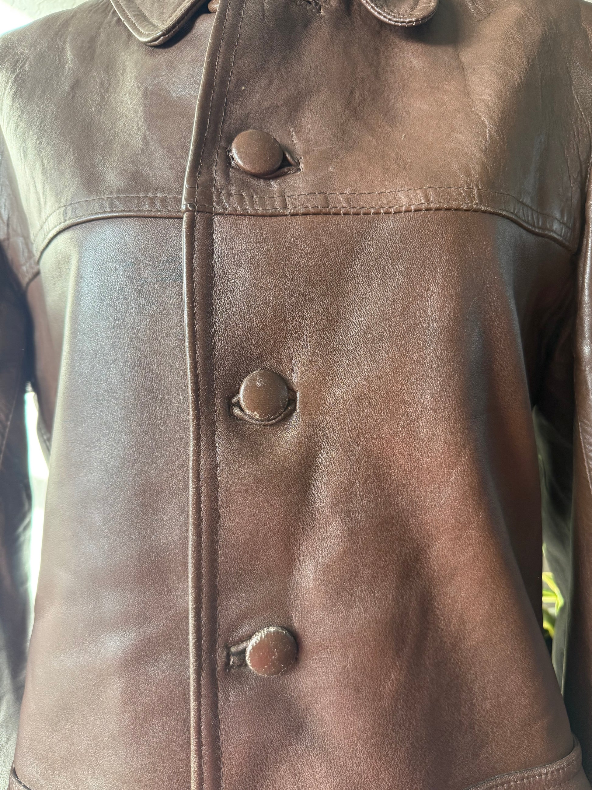 Vintage and made in England. Genuine leather. Great condition, but the buttons have some wear. Overall a high quality staple piece that will last for decades. Women's M / Men's S.