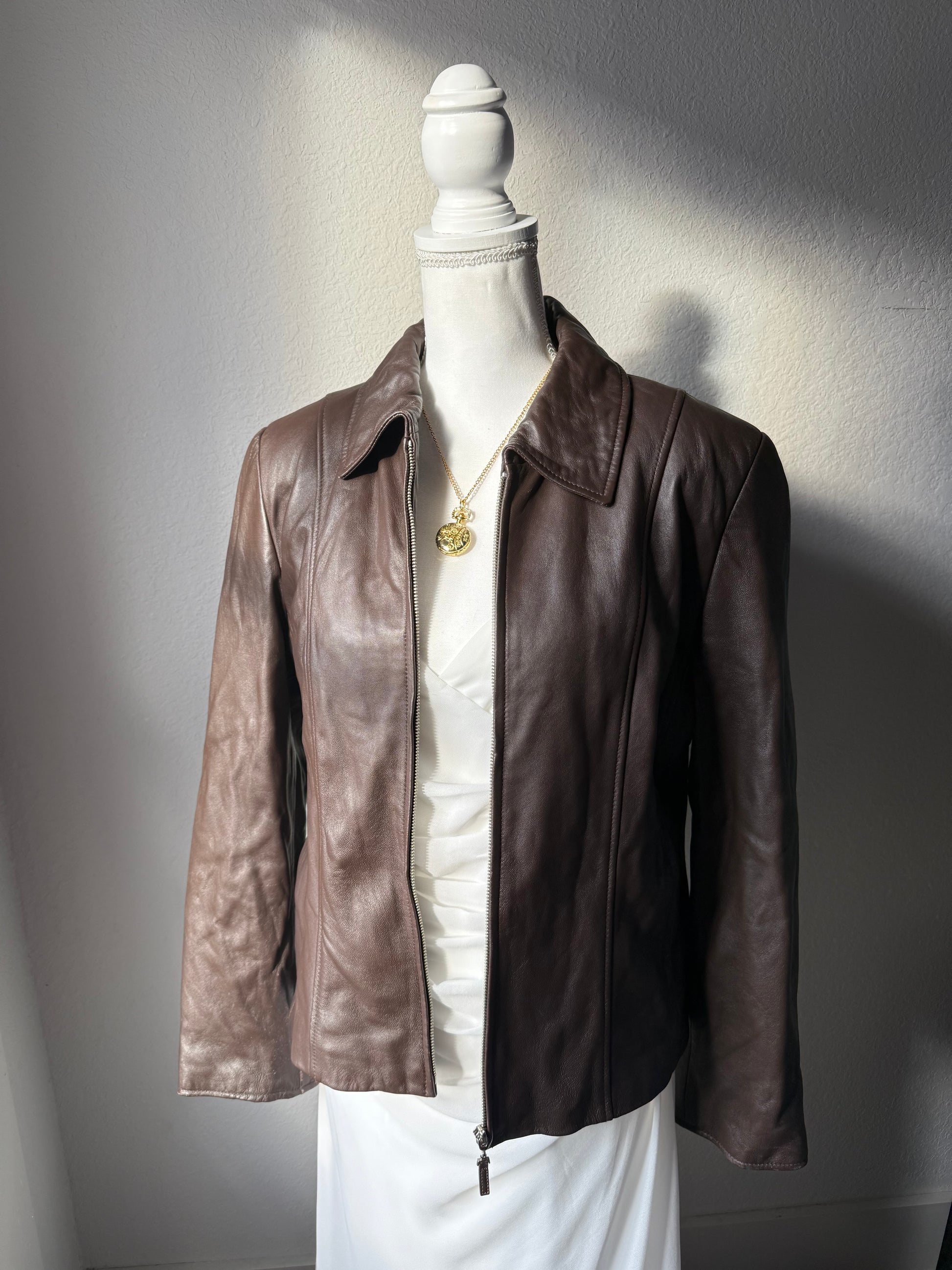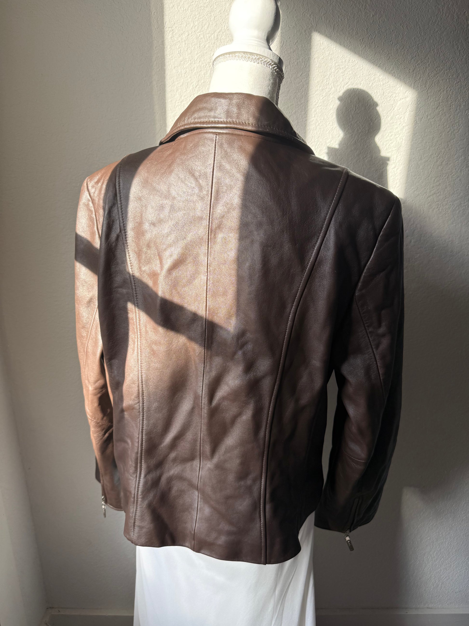 Dark brown genuine leather zipped jacket. Women's L / Men's M.