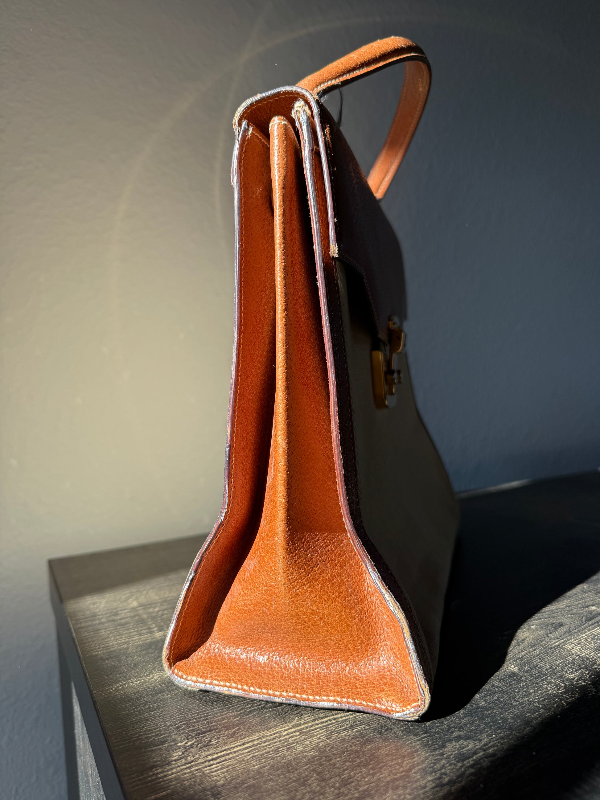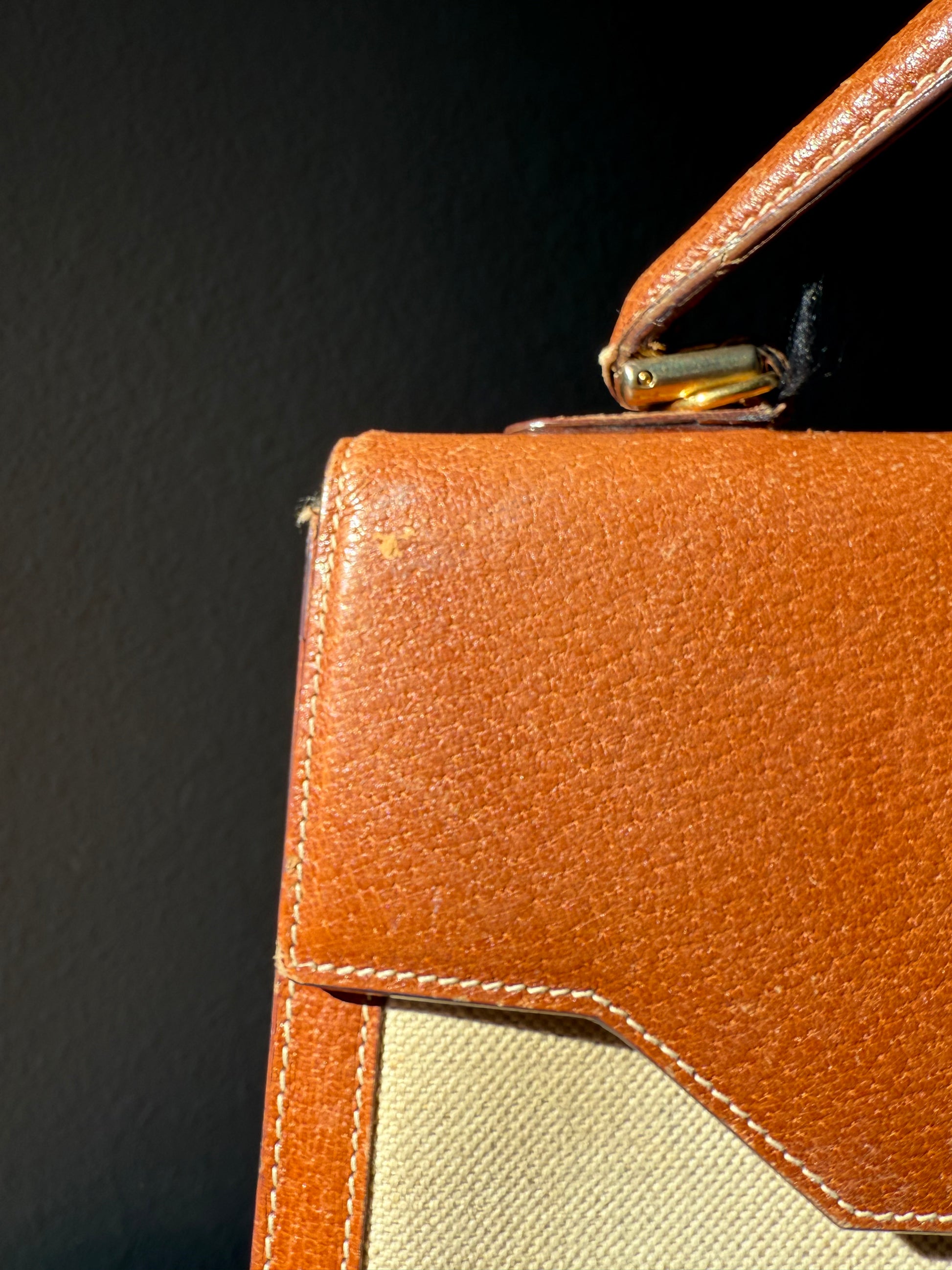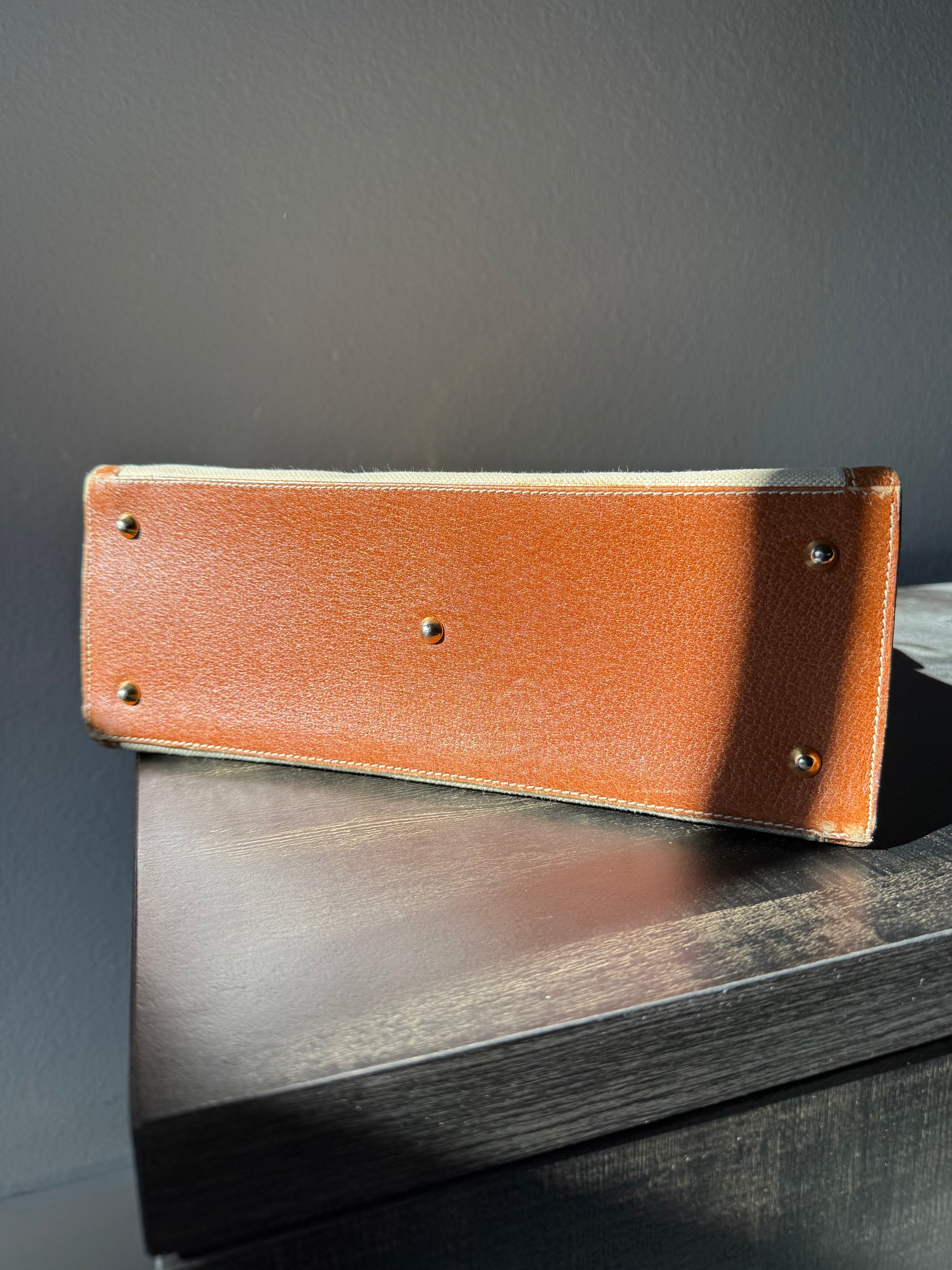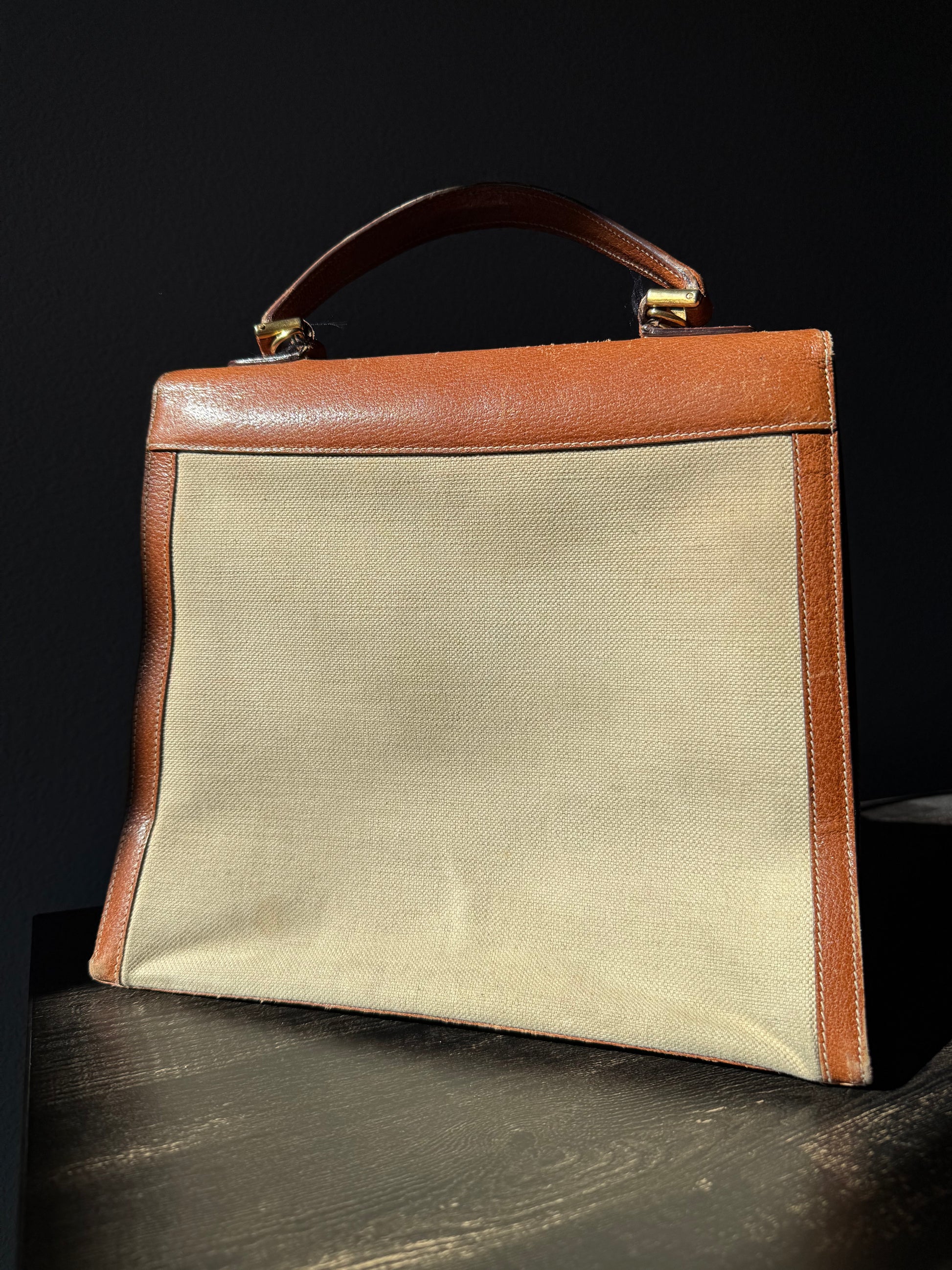 This vintage Gucci handbag features a sophisticated brown leather trim and a cream canvas body, perfect for any occasion. Its classic design and high-quality materials make it a must-have accessory.