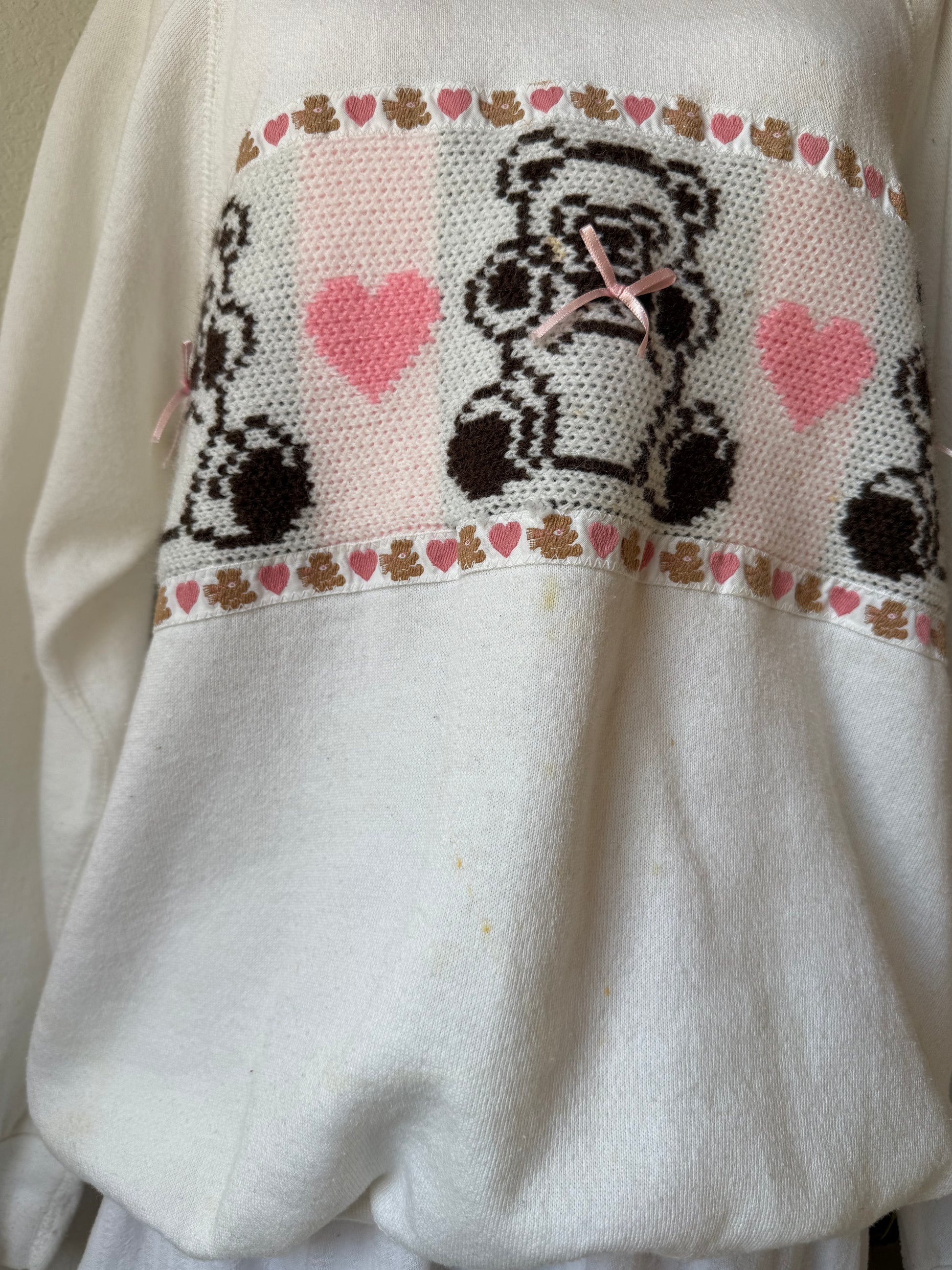 Vintage teddy bear sweater with hearts and bows. SUCH a cutie!! This has some stains shown in the photos. Women's L.
