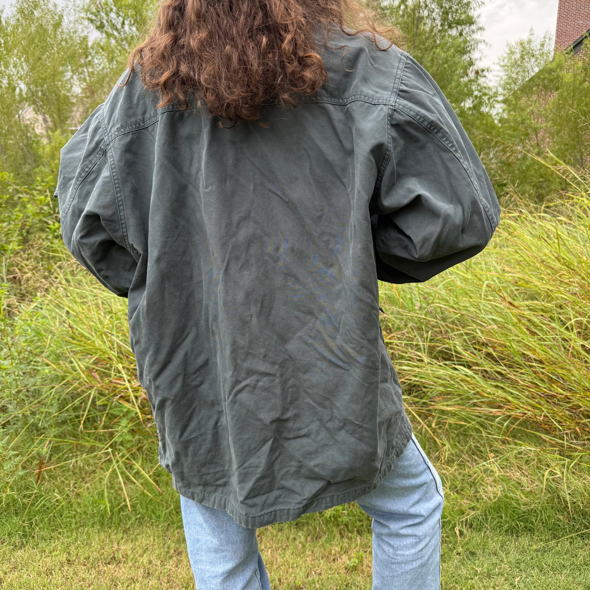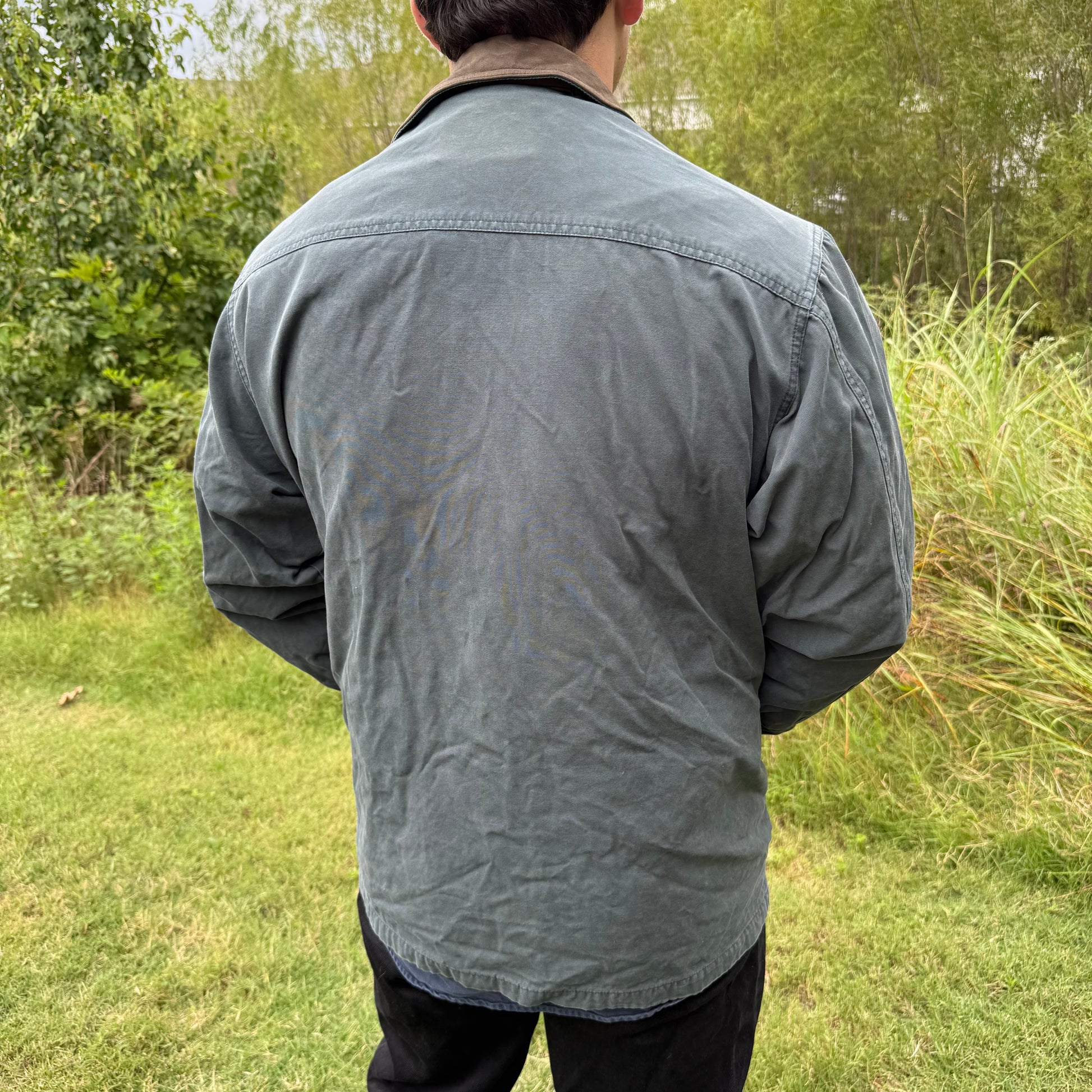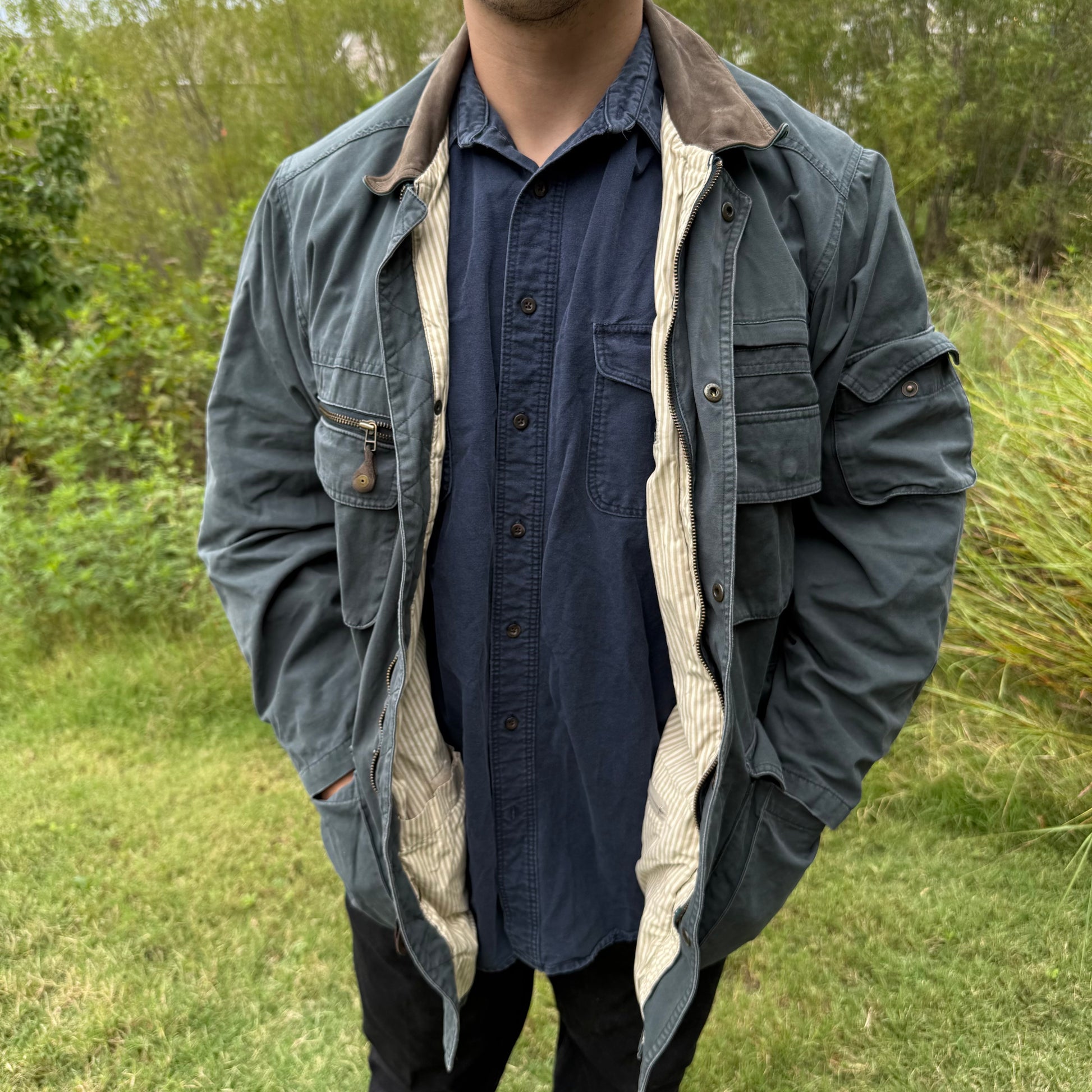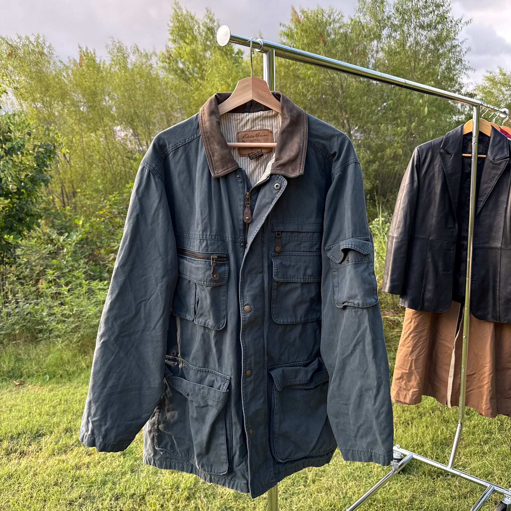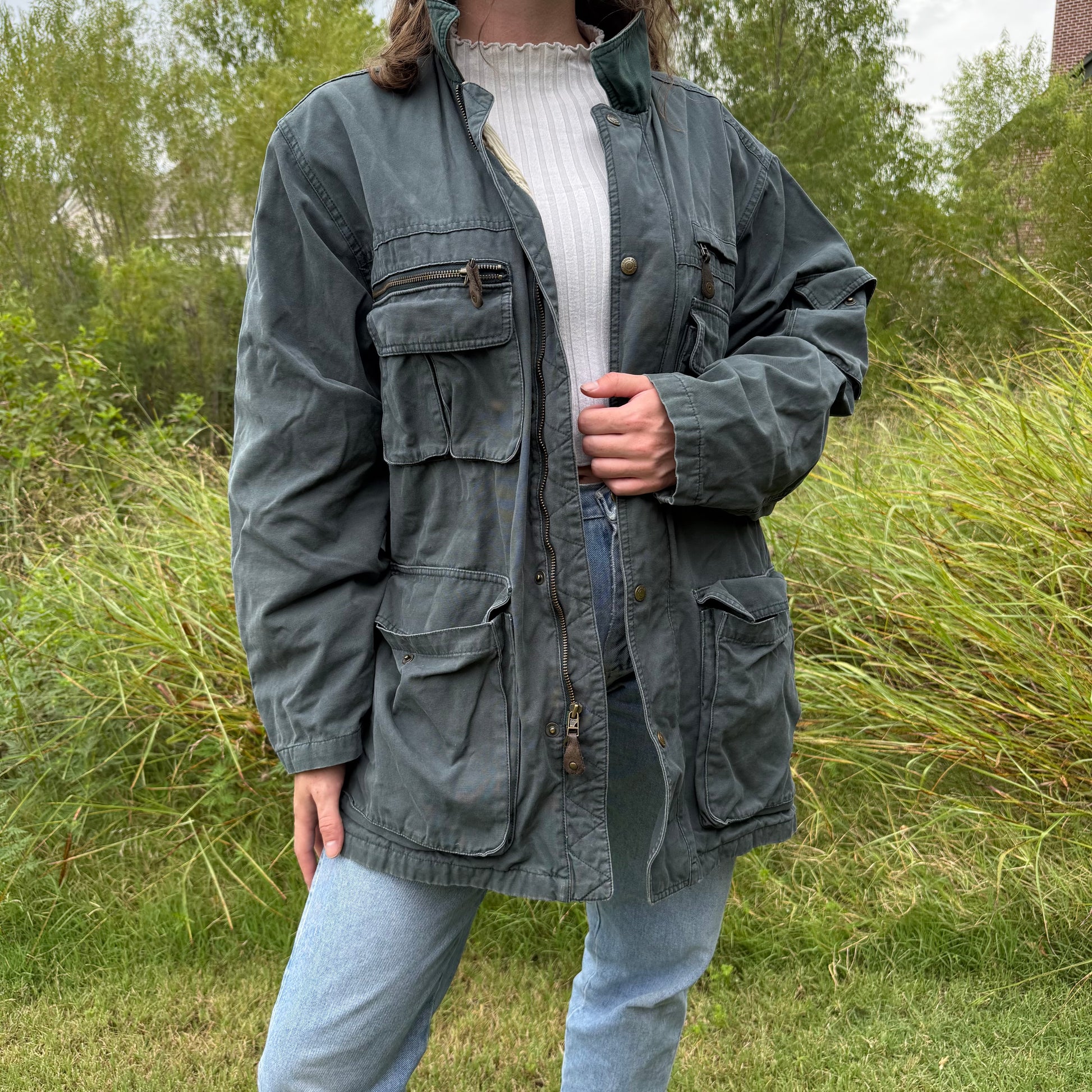 Amazing green vintage Eddie Bauer jacket with a brown collar and pinstripe interior. This deep green color is gorgeous, and this jacket has so many pockets.