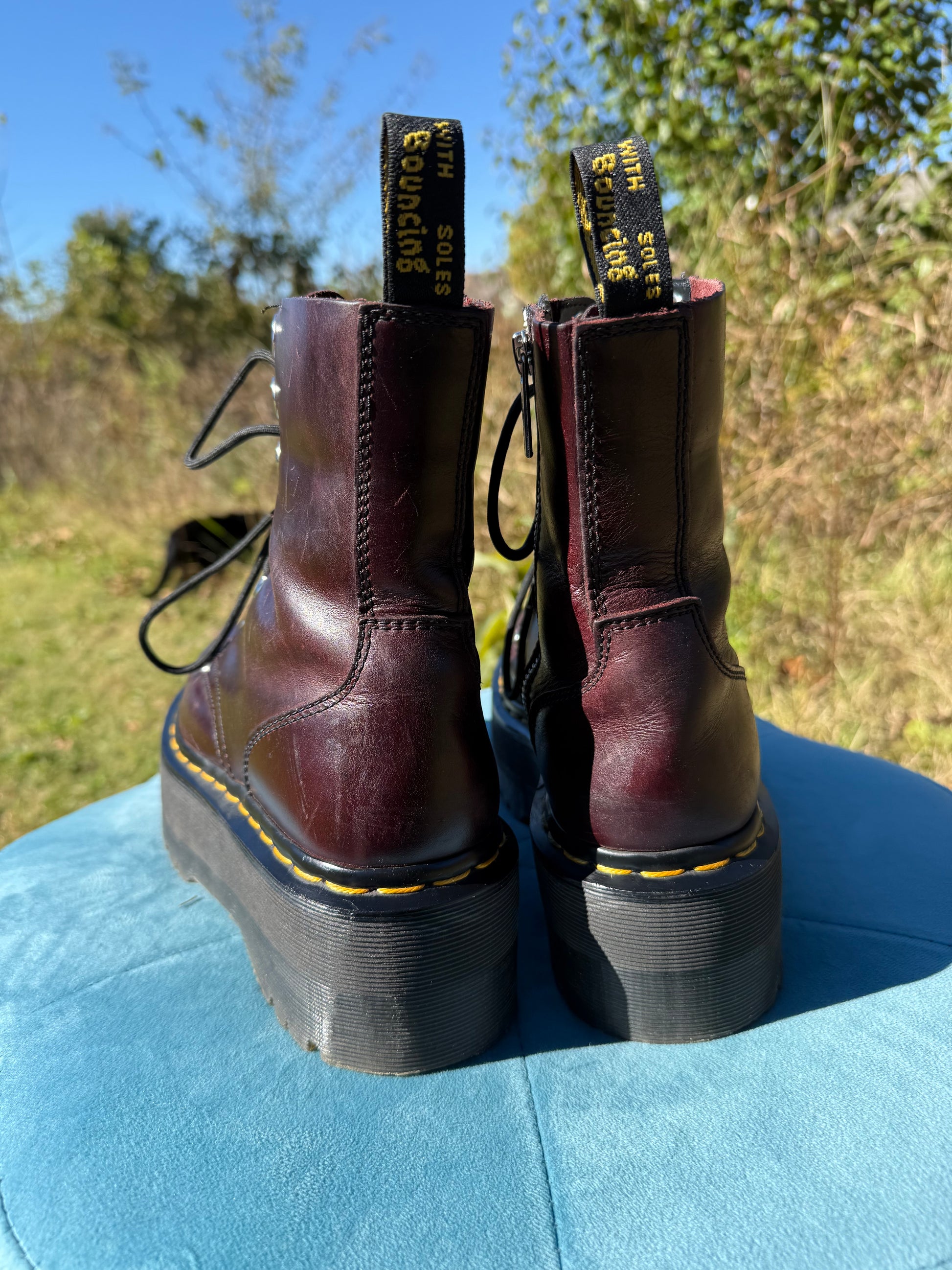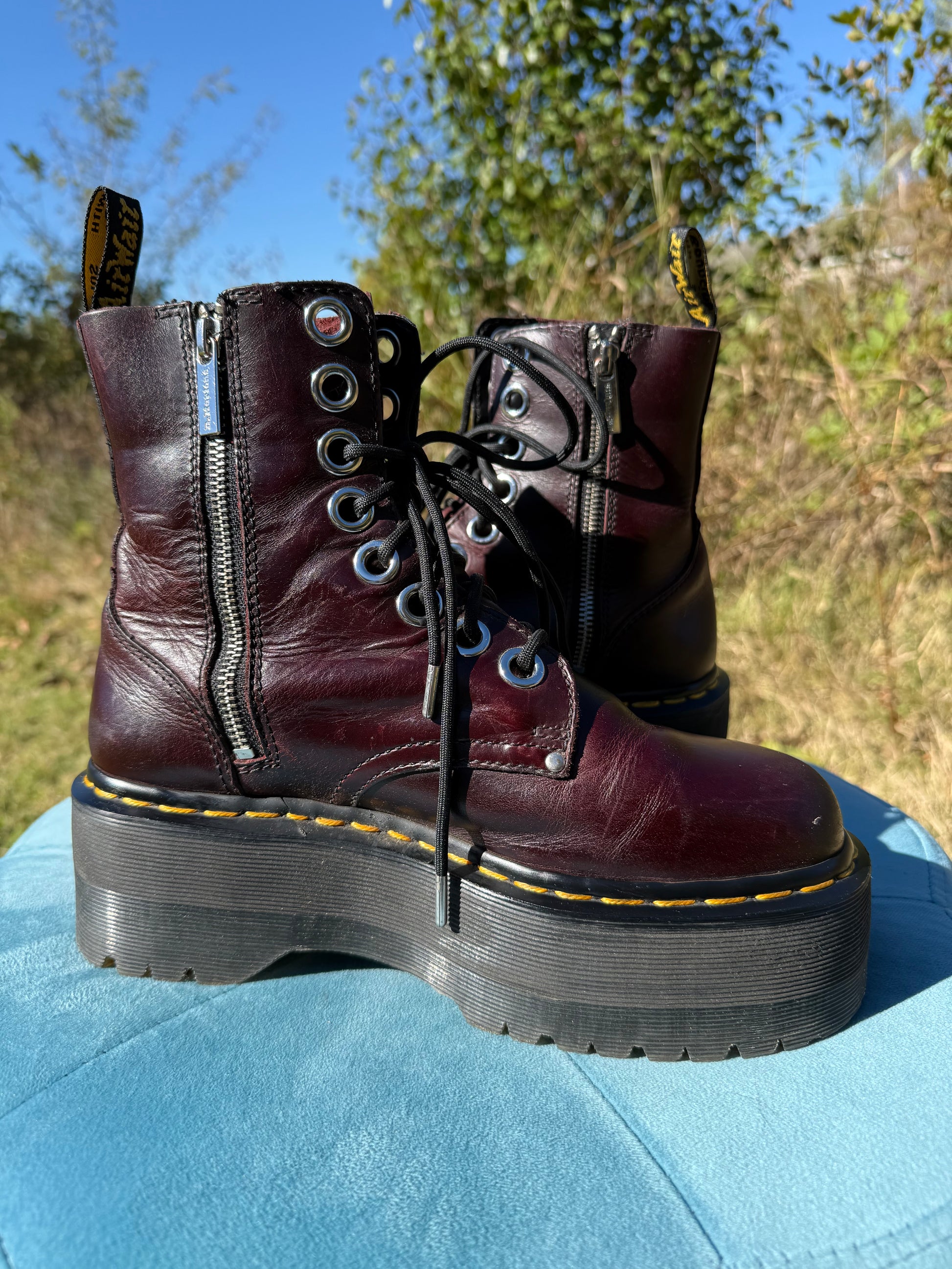 The perfect fall boots. This color is gorgeous, especially paired with the grommets and max platforms. They look great swapped out with ribbon laces as well. Good condition with some minor scuffing shown.