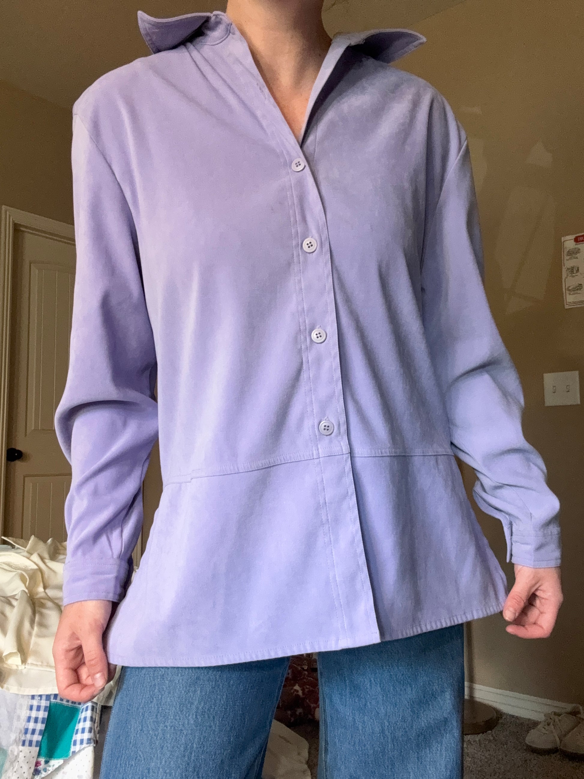 Prettiest shade of lavender on this buttonup shirt. Women's XL/Men's L.
