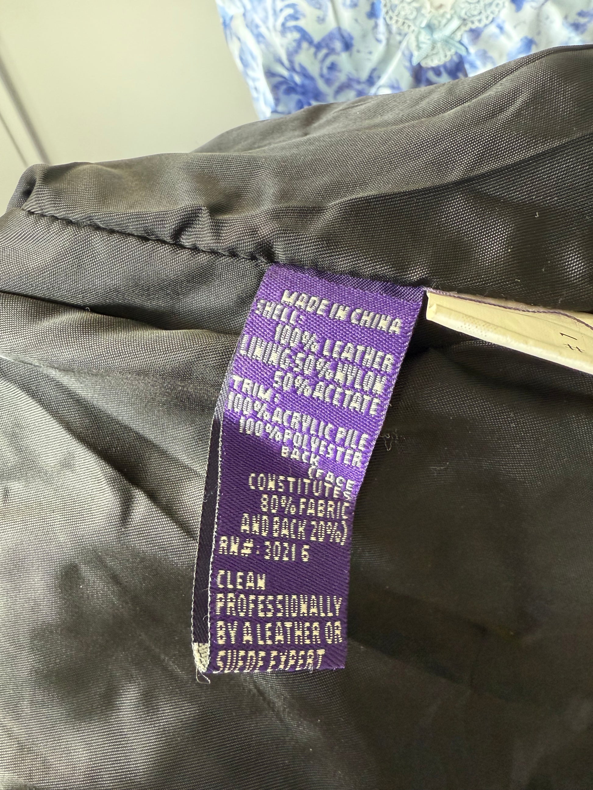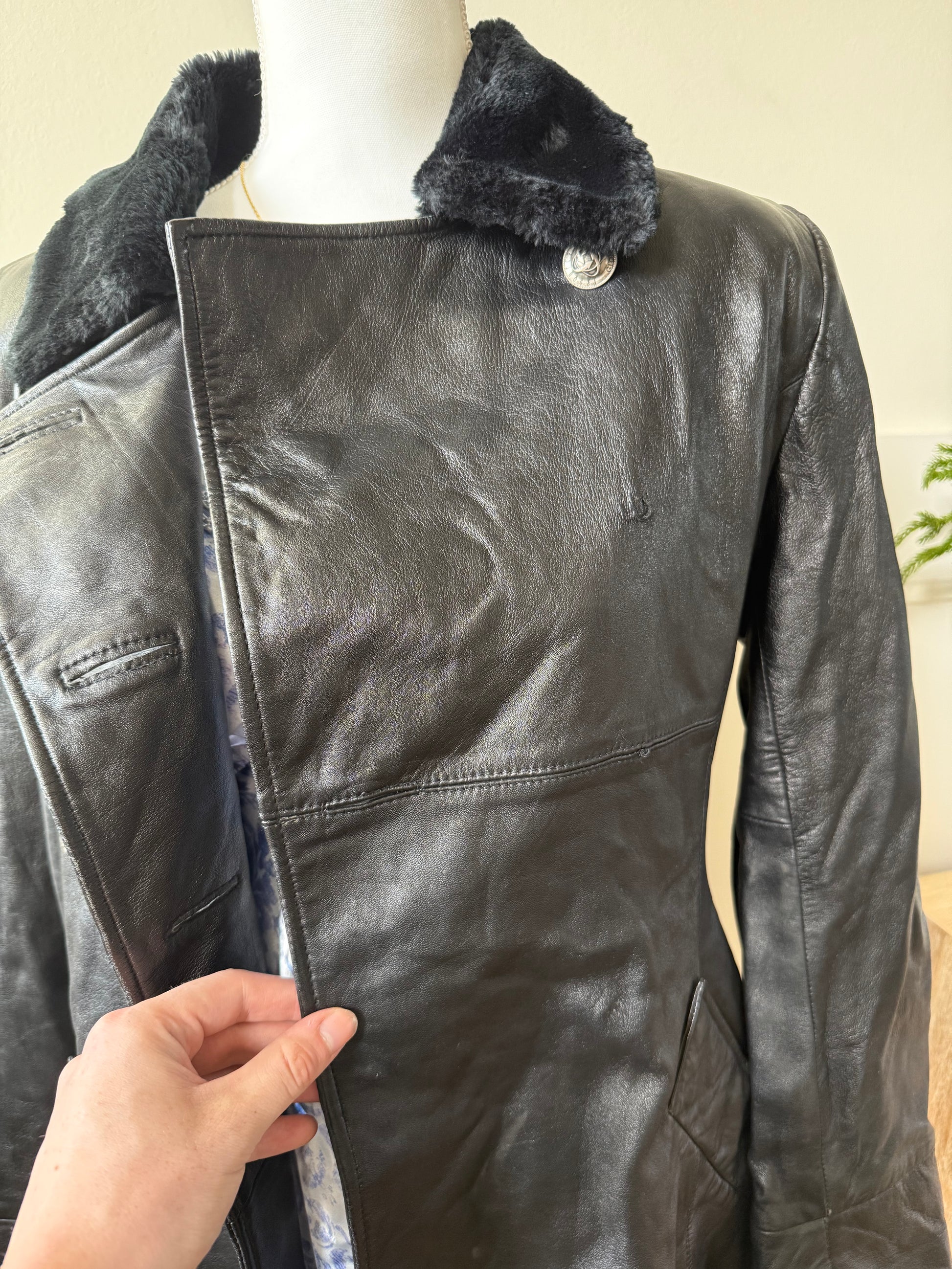Black genuine leather coat with a faux fur collar and cuffs. Metal buttons, but one set of them is gone.
