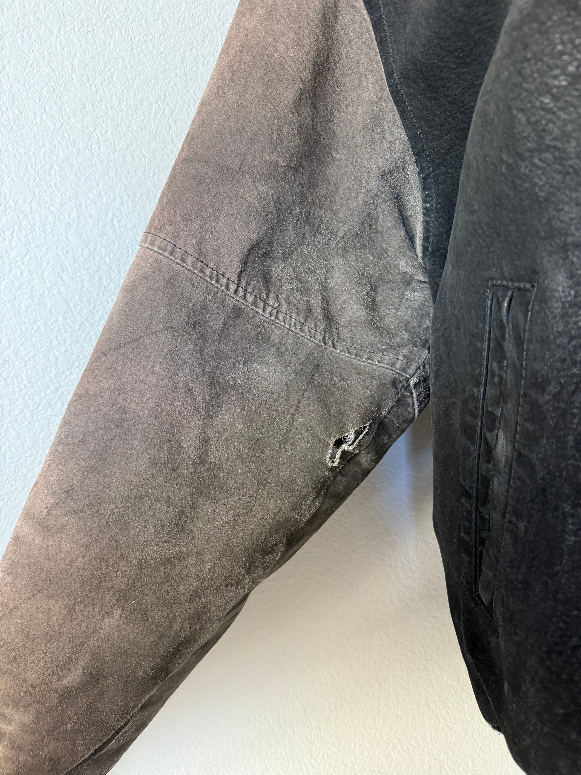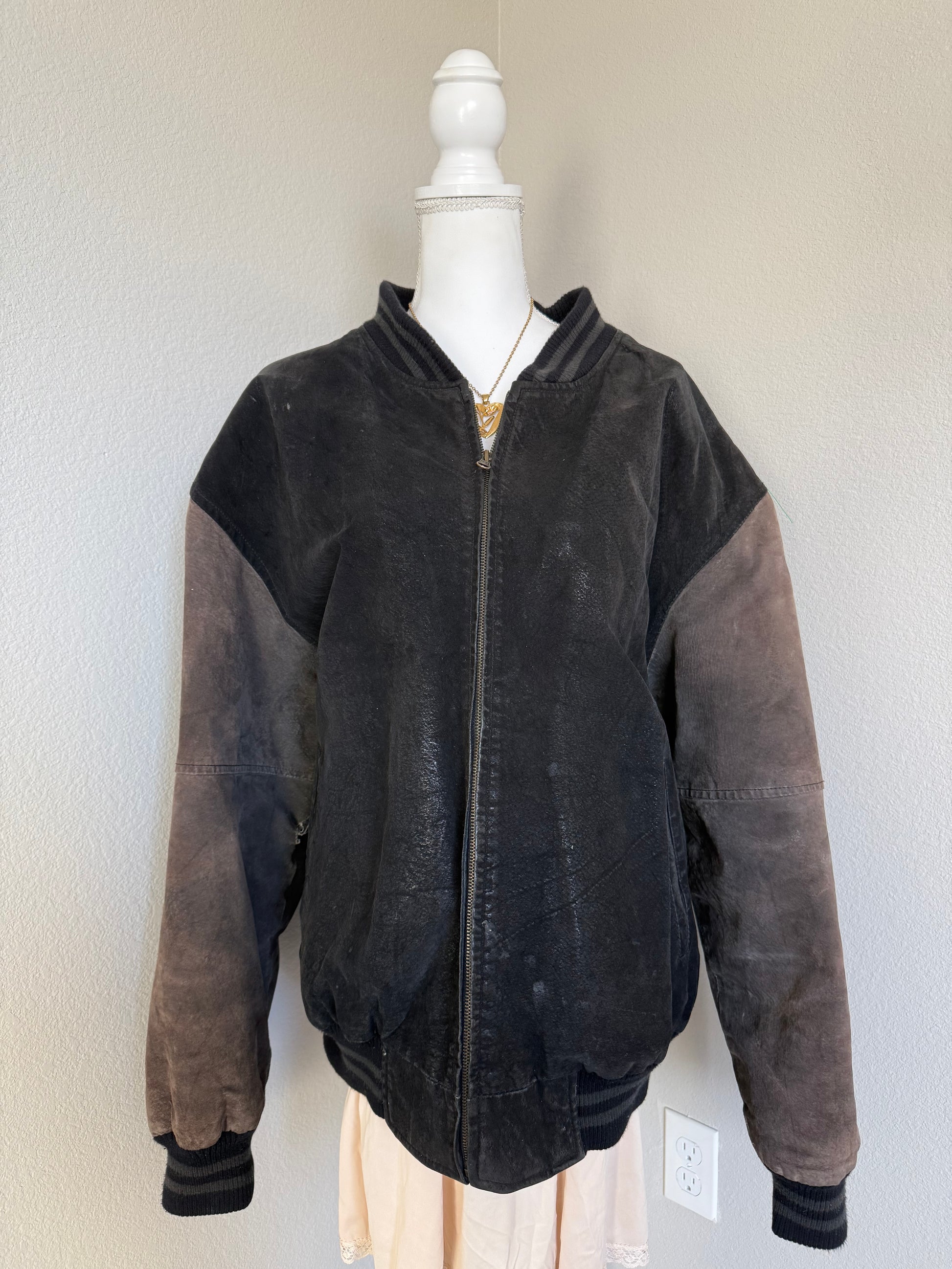 Vintage suede leather varsity jacket. Light brown and faded black color. There are some marks and a slight rip shown in the photos. Women's XXL / Men's XL.