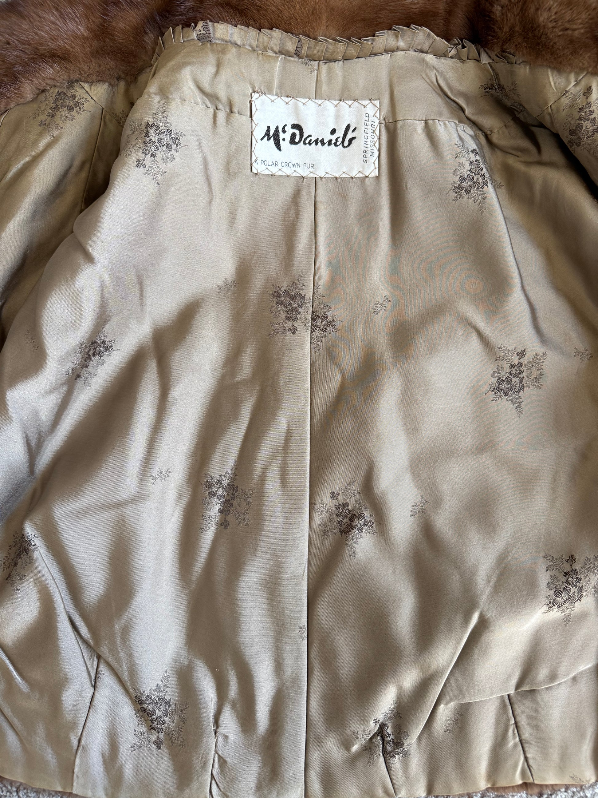 Genuine mink fur stole. This vintage real fur coat is so gorgeous and soft! It's in great condition too. Brand is McDaniel's from Springfield, Missouri. Polar crown fur. The shawl lining has the prettiest flowers too. Fits a Women's L or below.