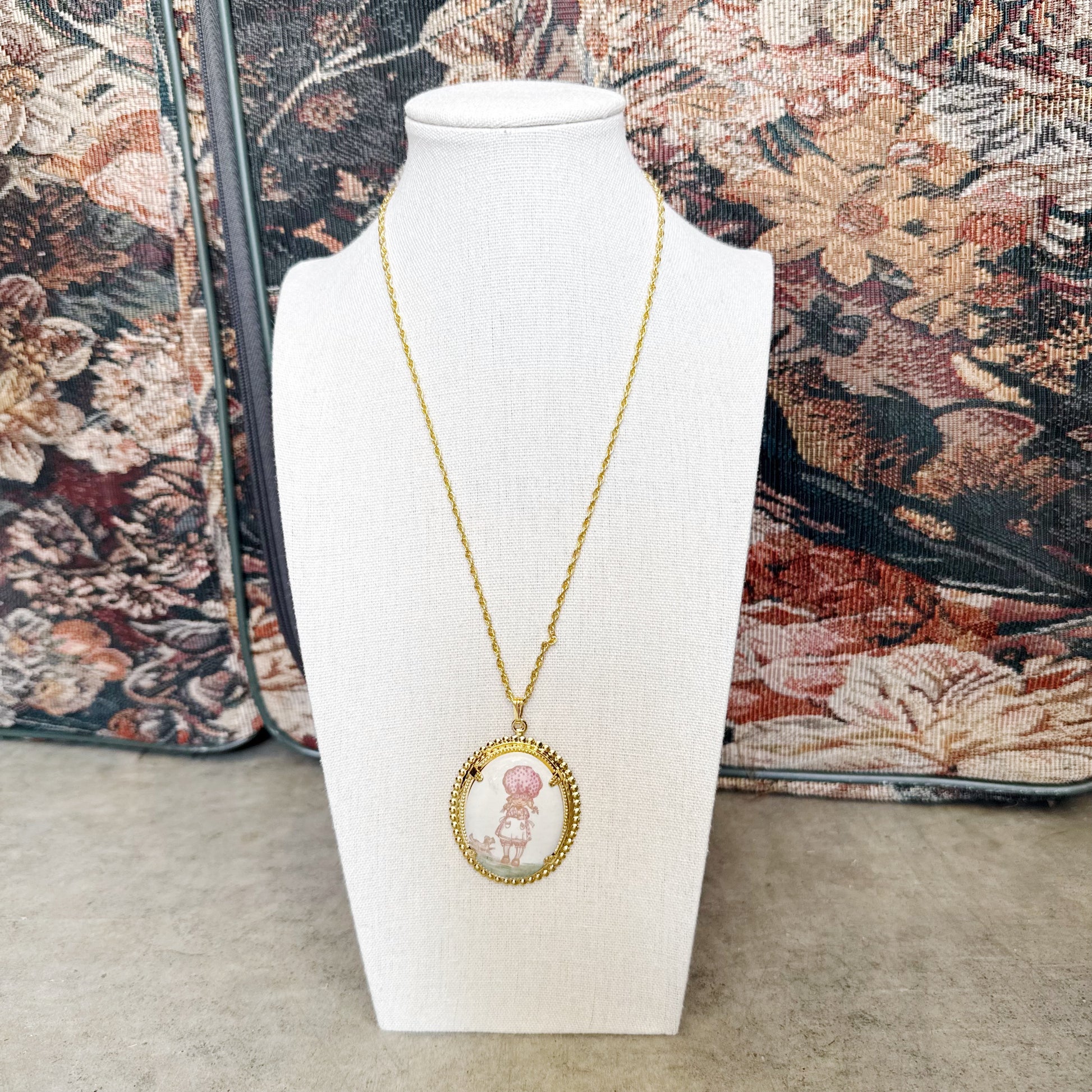 Cutest vintage gold pendant necklace with a little girl and a dog.