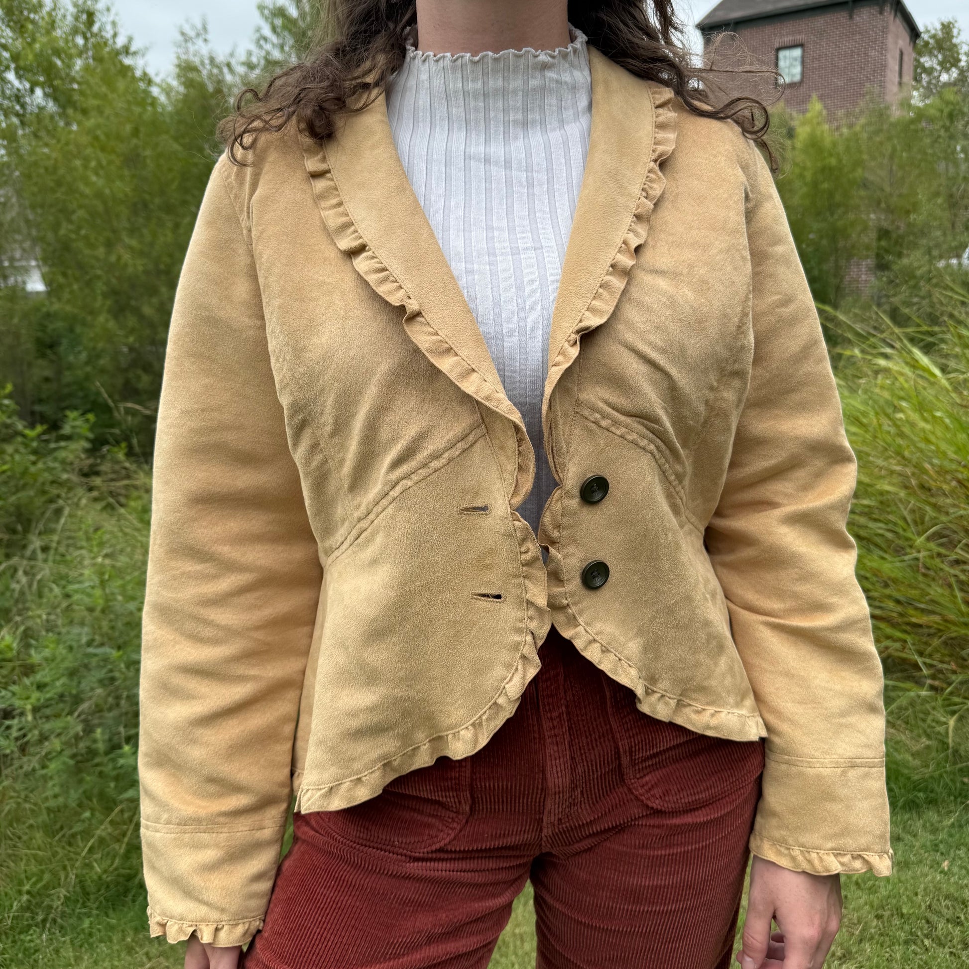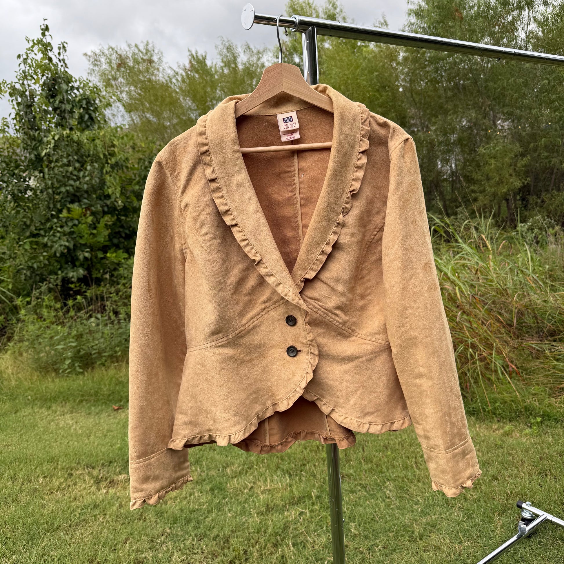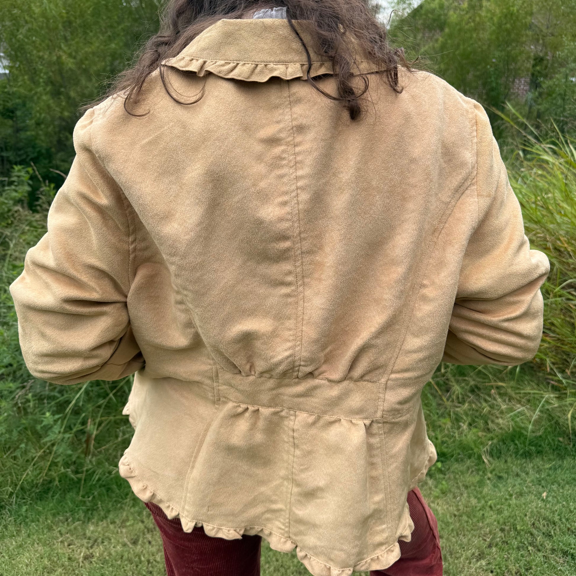 Faded Glory tan suede blazer with the cutest ruffles. Lightweight and perfect as we transition to fall.