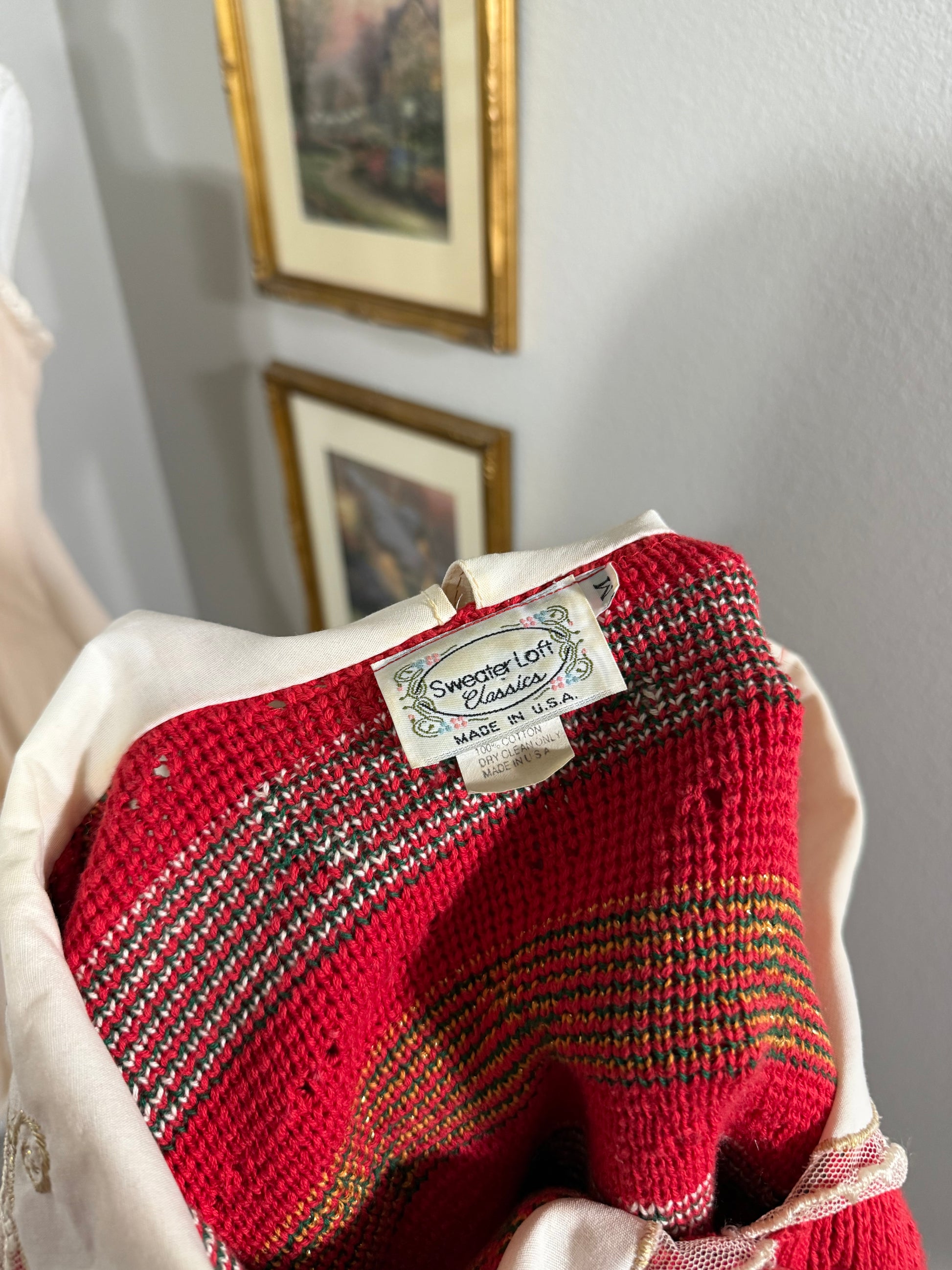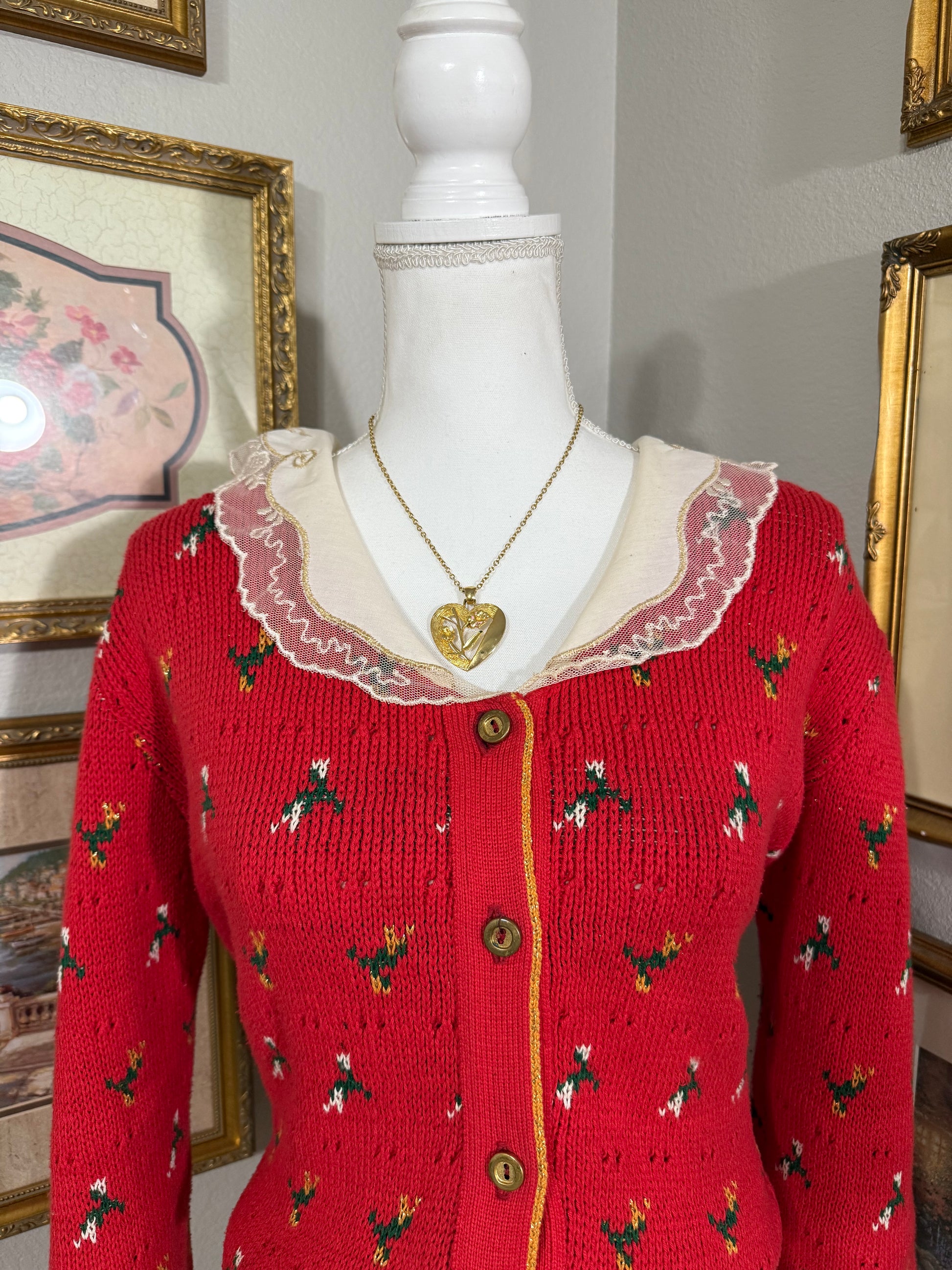 Sweater Loft Classics vintage and Made in USA, 100% cotton. Gorgeous red sweater with floral knit details and gold trim on the sweater and peter pan collar. The collar also has lace! This is such a gorgeous cardigan! Tagged a Women's M, runs a little large.