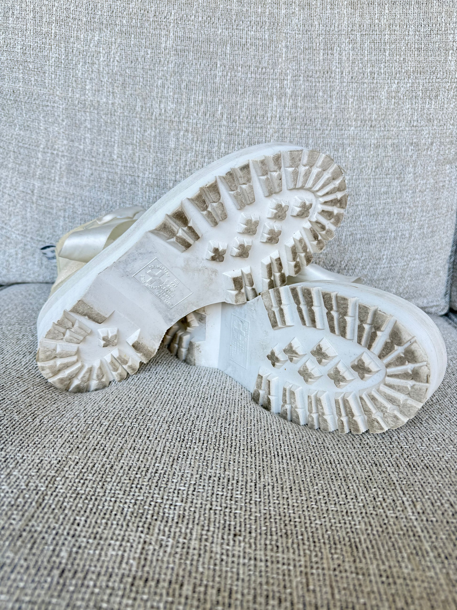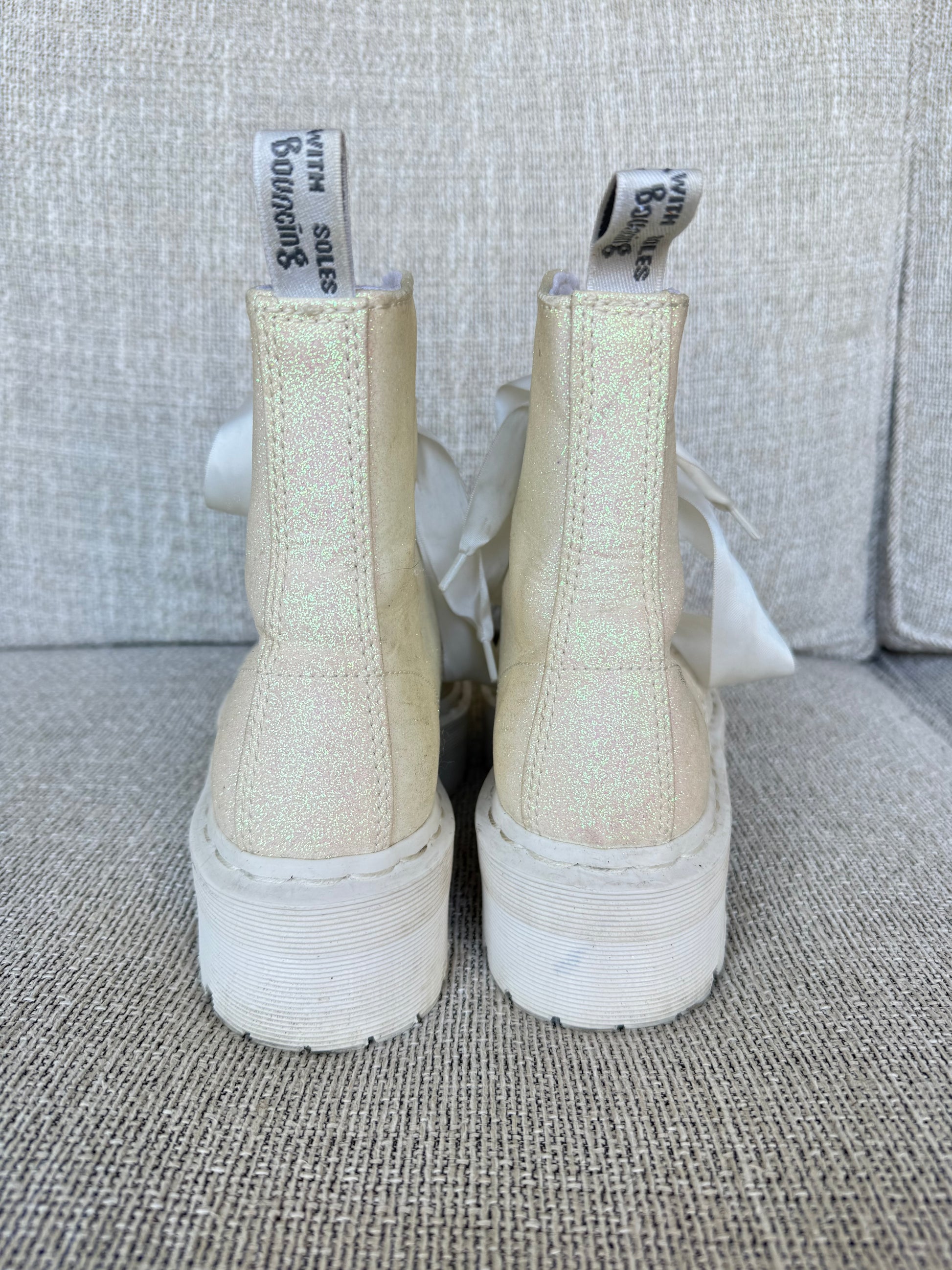 Rare white glittery Molly platform boots with white soles and ribbons. There is some minor wear, but overall these are still very white in person and have all the glitter!