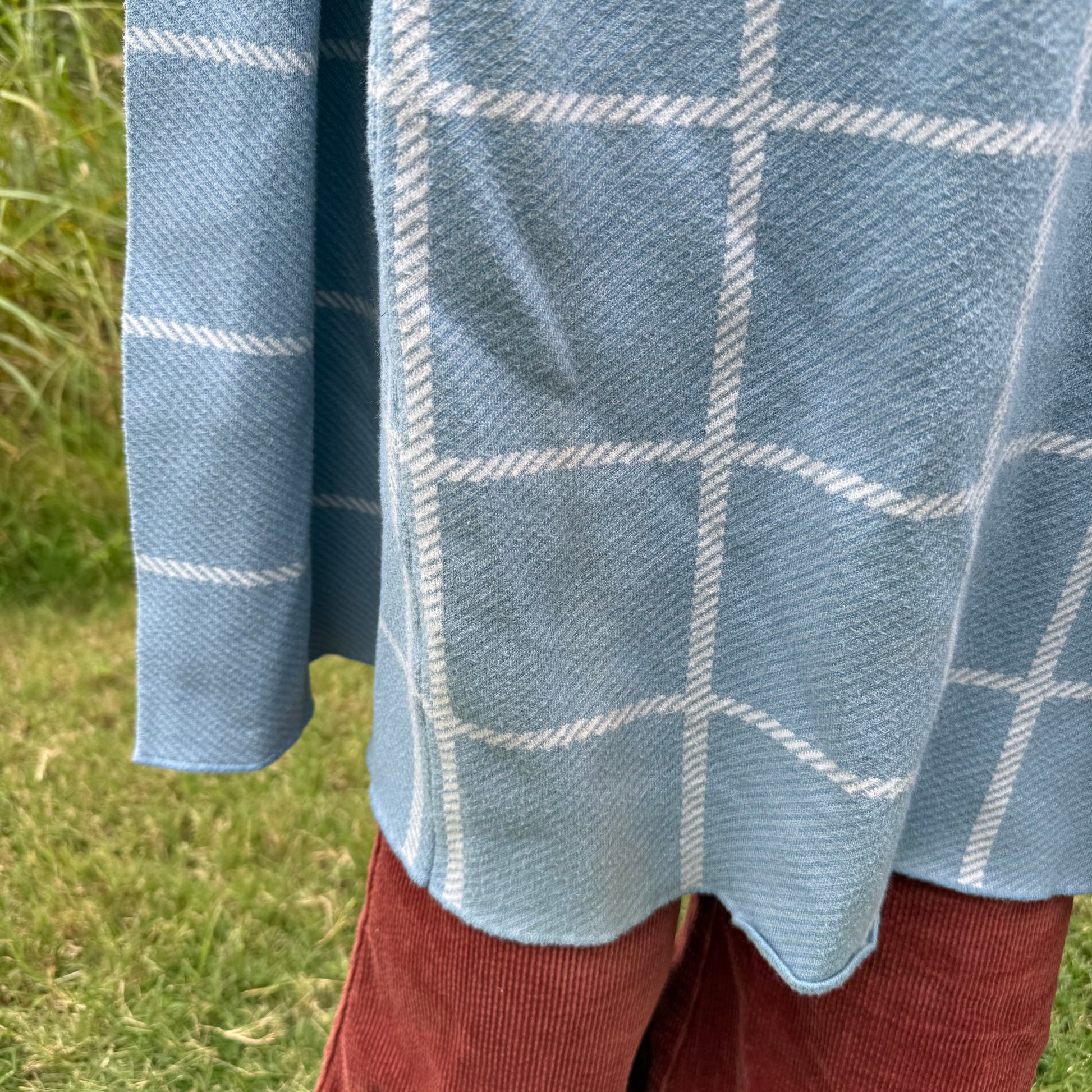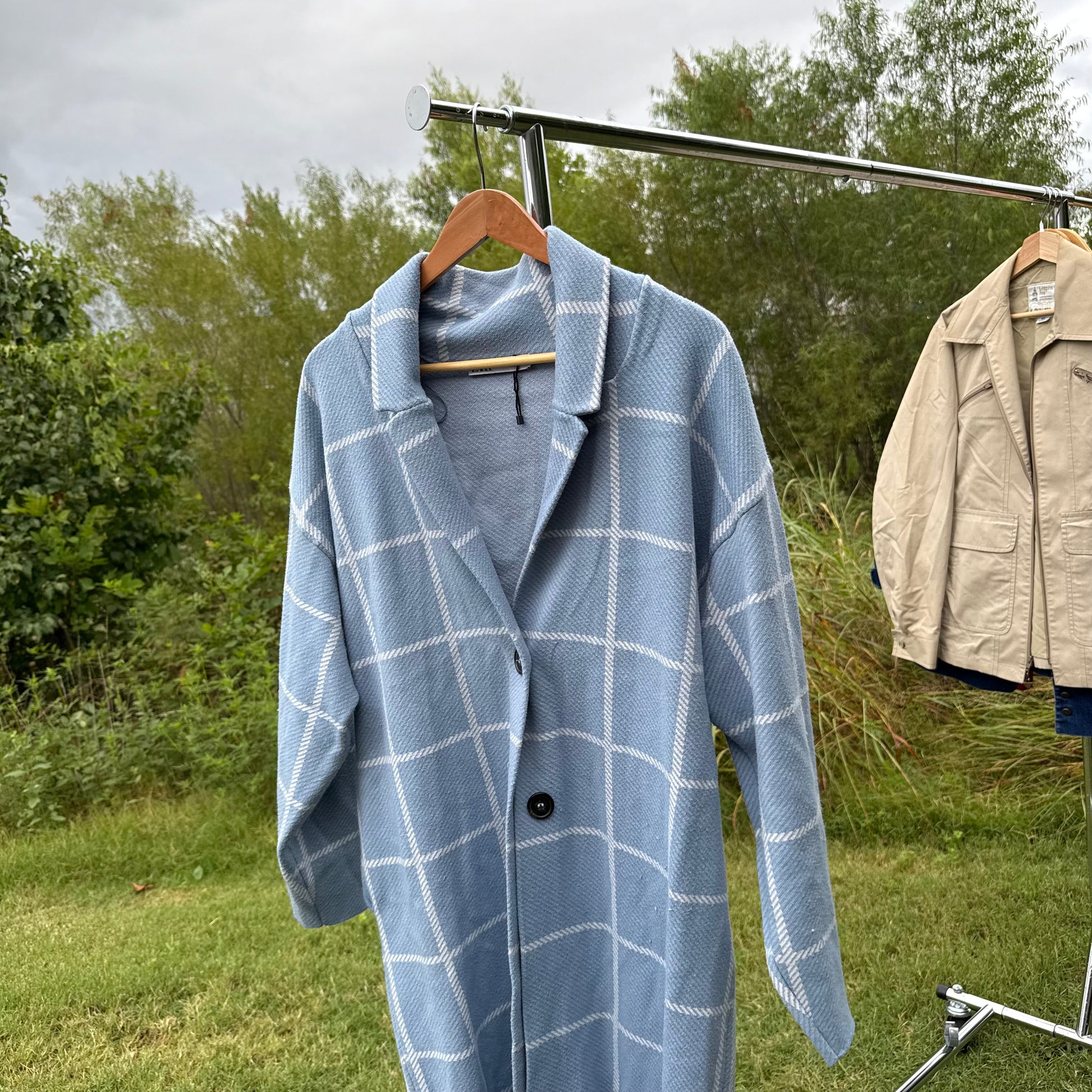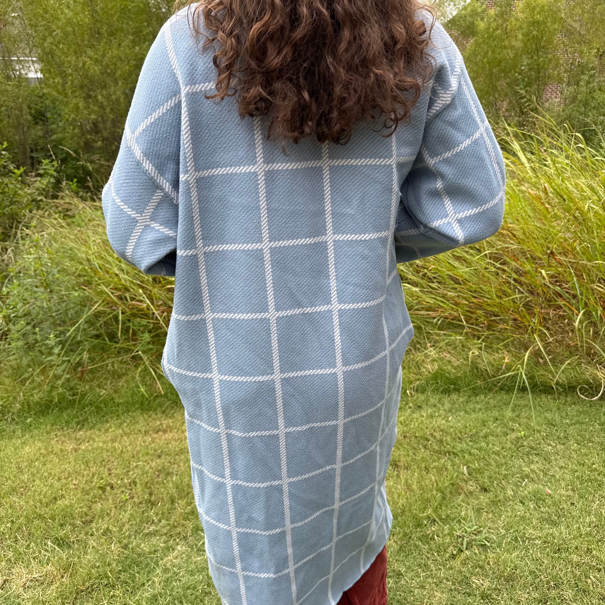 Gorgeous blue plaid long coat from Zara. It still has the string from the tag, so it is likely unworn. Very light discoloration shown at the bottom.